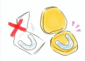 - 必須アイテム:アライナーを外した際に保管するための専用ケース。外出先で食事をする時などにアライナーを外す必要があるため、衛生的に保管するためのケースが必要です。ケースがないと、アライナーを袋に入れたり、ポケットに入れて汚れや紛失のリスクが高くなります。
